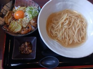炙り牛シマチョウ丼と淡麗塩鶏そば えびオイルで味変